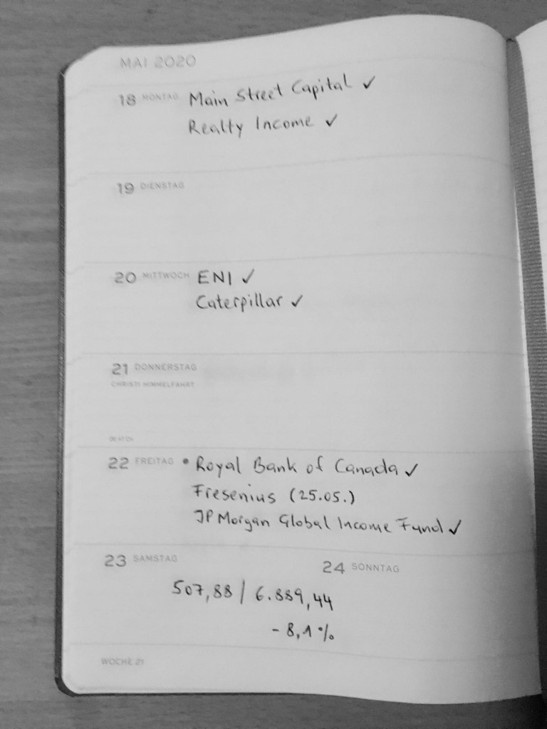 Die ursprünglich in der Vorwoche erwartete Procter & Gamble Dividende traf Anfang KW 21 ein. Dafür habe ich diesmal Fresenius im Kalender falsch eingetragen. Es war im Vorjahr der 22.05.2019, für heuer ist Montag der 25.05.2020 als Zahltag kommuniziert 🥴