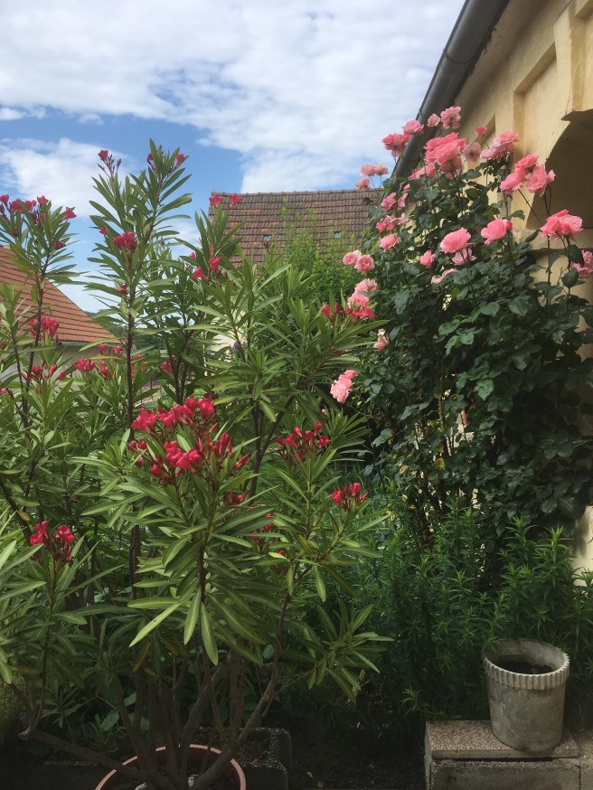 Aktuell blüht alles im Garten – z.B. die Oleander und Rosen 🌹 Im Hintergrund ist aber ein 100 Jahre altes Dach das im Herbst getauscht werden wird.