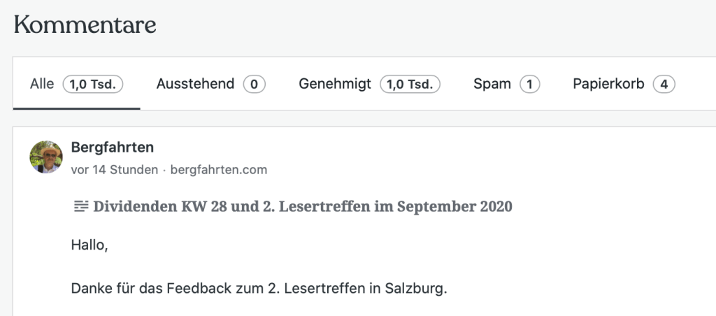 Zuletzt ein kleines Feedback aus meinem Blog. Diese Woche hat mich WordPress informiert dass bereits 1.000 Kommentare zu Beiträgen erfasst wurden – wobei natürlich auch meine Antworten mitgezählt sind…