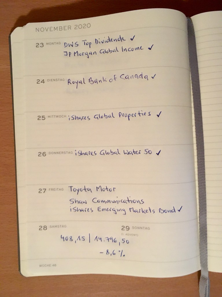Eine Währungswechsel in Royal Bank of Kanada und für einen Immo-ETF fehlen wohl wegen den US-Feiertag. Auch kleinere Einnahmen von Toyota Motor und Shaw Communications werden noch Anfang nächster Woche für November eintreffen 🙂