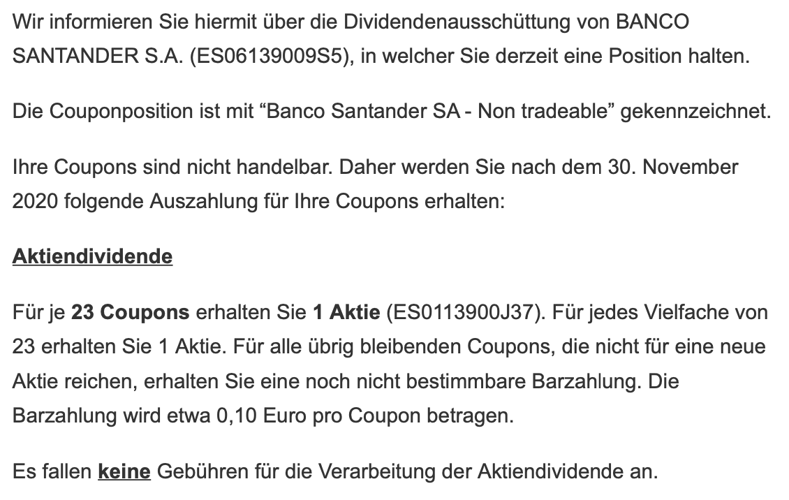 Nun zahlt Banco Santander halbjährlich, die erste entfiel wegen der ETF Empfehlung und nun kommen zumindest noch die Script-Dividende in 2020 dazu 🤗