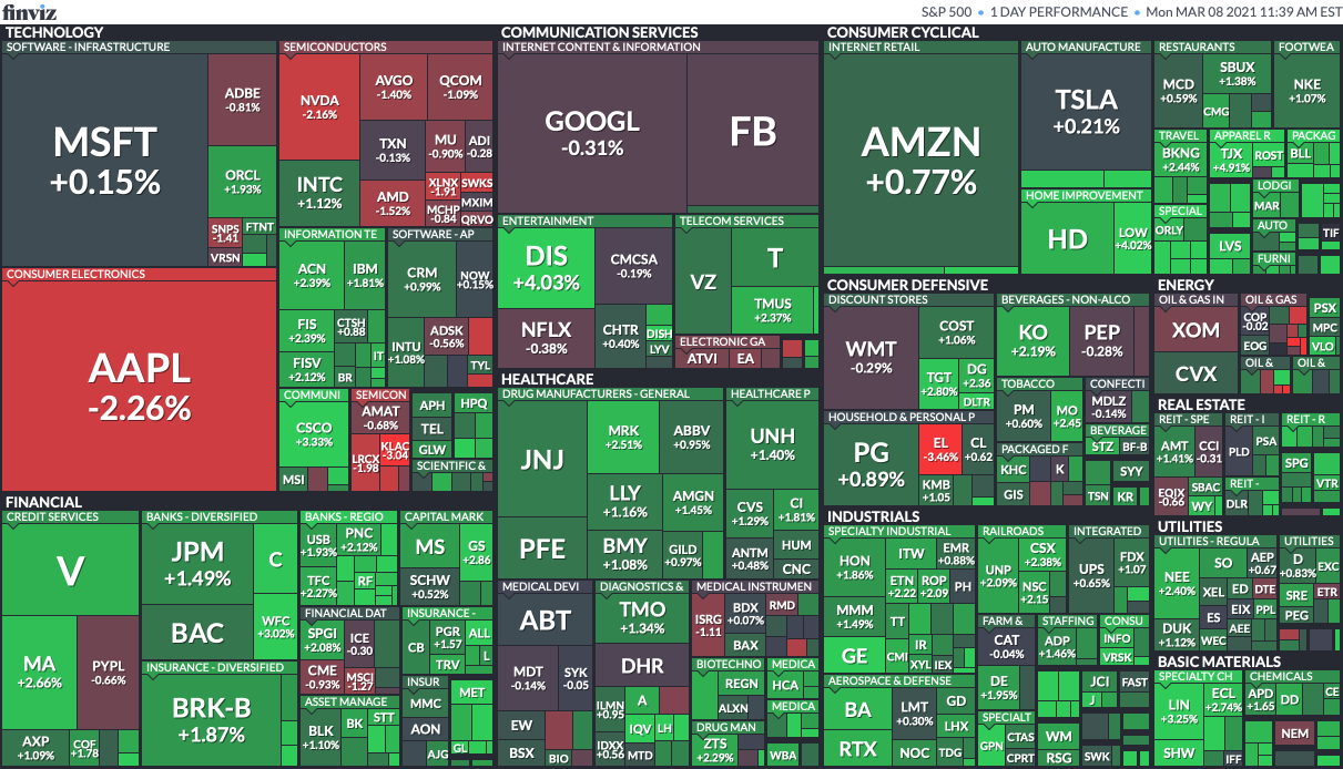 Empfehlenswert finde ich als schnelle Information auch die grafischen Bildern und die Futures bei. Stand Montag 17:45 – Tech rot und der Rest bewegt sich zum 💚