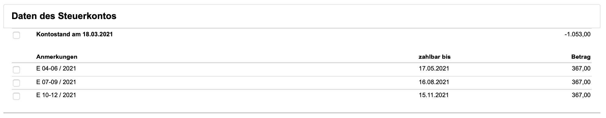 Licht: in der Nachforderung war aber meine bereits quartalsweise bezahlte Einkommensteuer von insgesamt 2.266 EUR für 2020 nicht berücksichtigt! Somit gibt sich final eine Abgaben-Gutschrift von 854 EUR. Für das erste Quartal 2021 hatte ich im Februar auch schon wesentlich höhere Steuern überwiesen und damit ergab sich ein positiver Kontostand von 1.053 EUR. Wenn man nun die Quartale 2-4 mit 367 EUR Steuern gegenübersetzt werde ich 2021 nur mehr 48 EUR im November an das Finanzamt überweisen müssen 😊