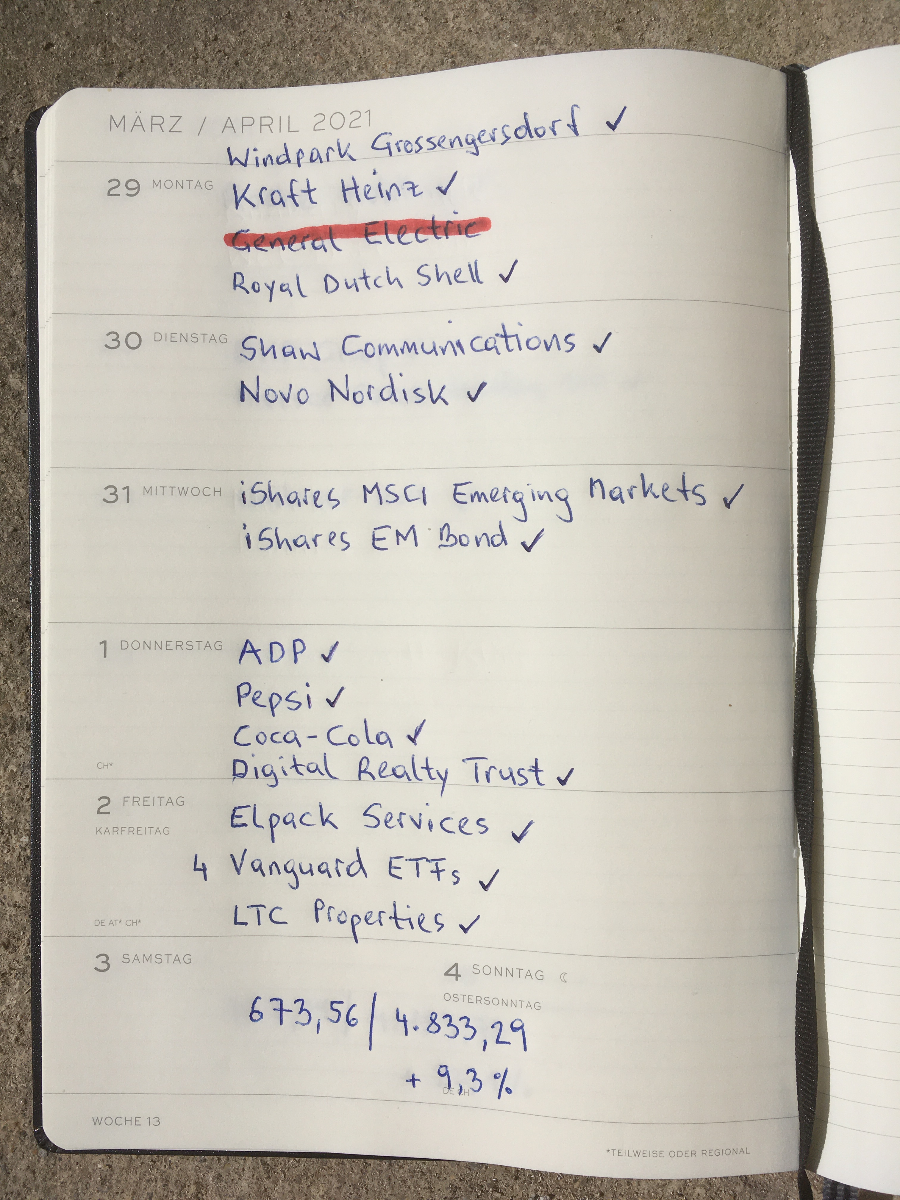 der April 2021 hat diese Woche als Börsentag eigentlich nur den Gründonnerstag. Karfreitag ist international ein Börsenfeiertag und manchmal sogar der Ostermontag. Für mich ist es einmal die Gelegenheit wirklich 4 Tage Urlaub von Mr. Market zu nehmen. Er hat sich mit den letzten Monaten auch ein paar freie Tage verdient 😉