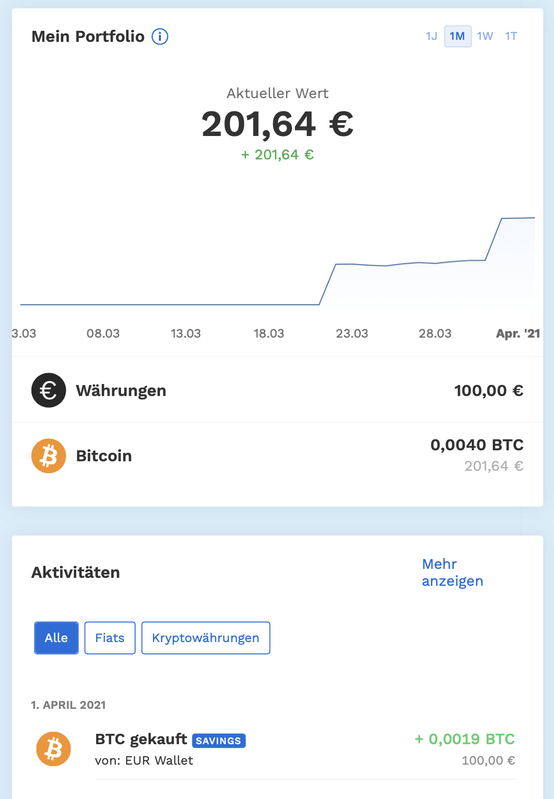 Der neue Sparplan für Bitcoin hat am 01. April funktioniert. Es wird eine Zeit dauern bis sich das für mich ähnlich automatisch wie Fonds-, ETFs- oder der Bausparer abläuft.