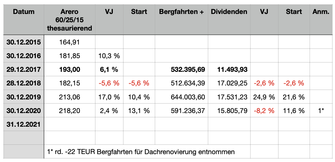 Hier vergleiche ich die Schwankungen zu den Vorjahren und zum Start 2017. In den ersten beiden Jahren war ich mit meinem Bergfahrten-Portfolio besser unterwegs und in 2020 schlechter. Eine Gesamtabweichung von +13,1% für ARERO und +11,6% trotz Entnahme finde ich ok.