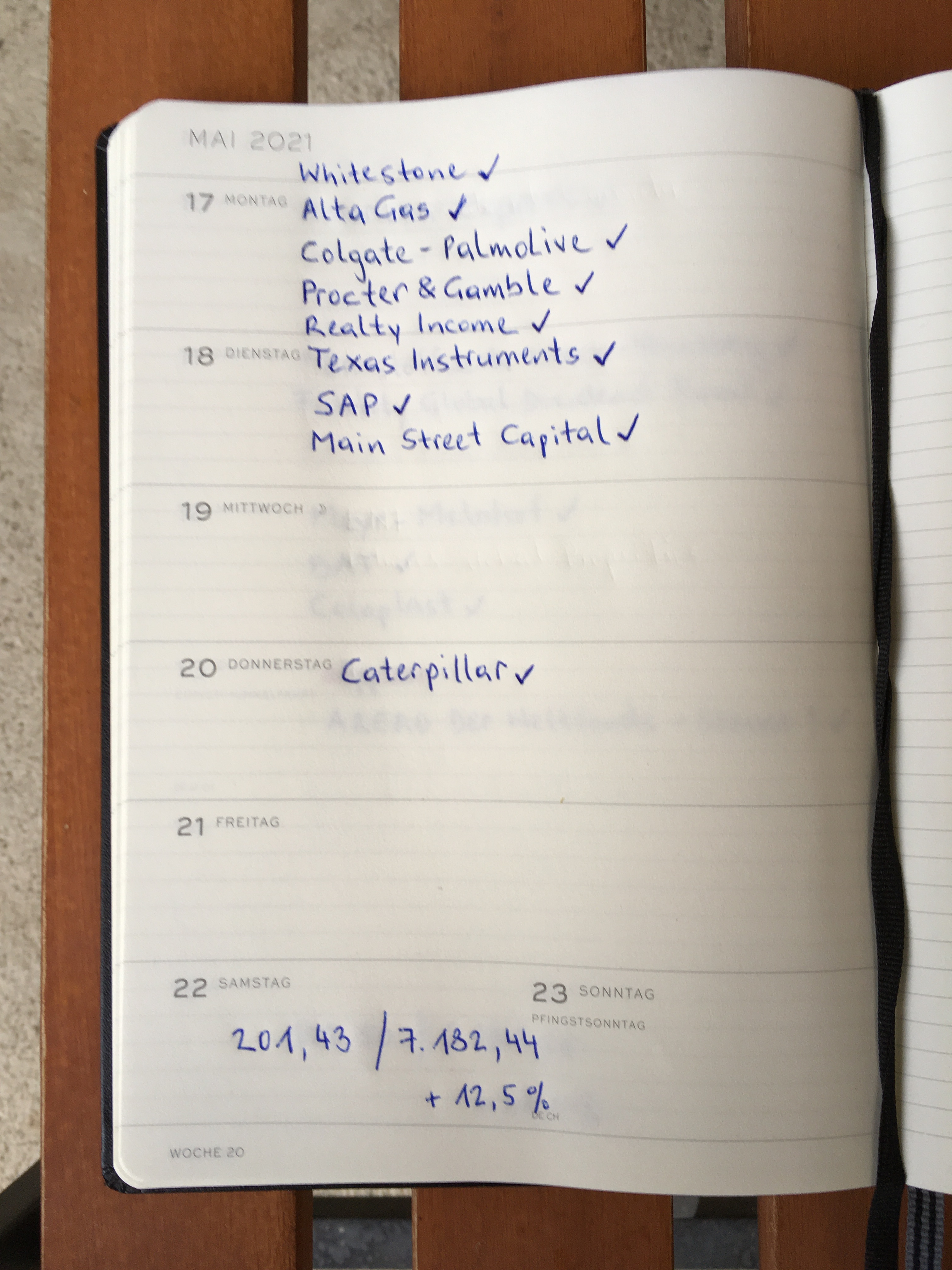 Es verbleibt diesmal die Dividenden Einkommen der KW 20 / 2021 wobei ich mich über das überschreiten der 7 TEUR Grenze gefreut habe. Zuerst einmal auf die Monatsübersicht der Aktien und somit ist die 3. Maiwoche wichtig: