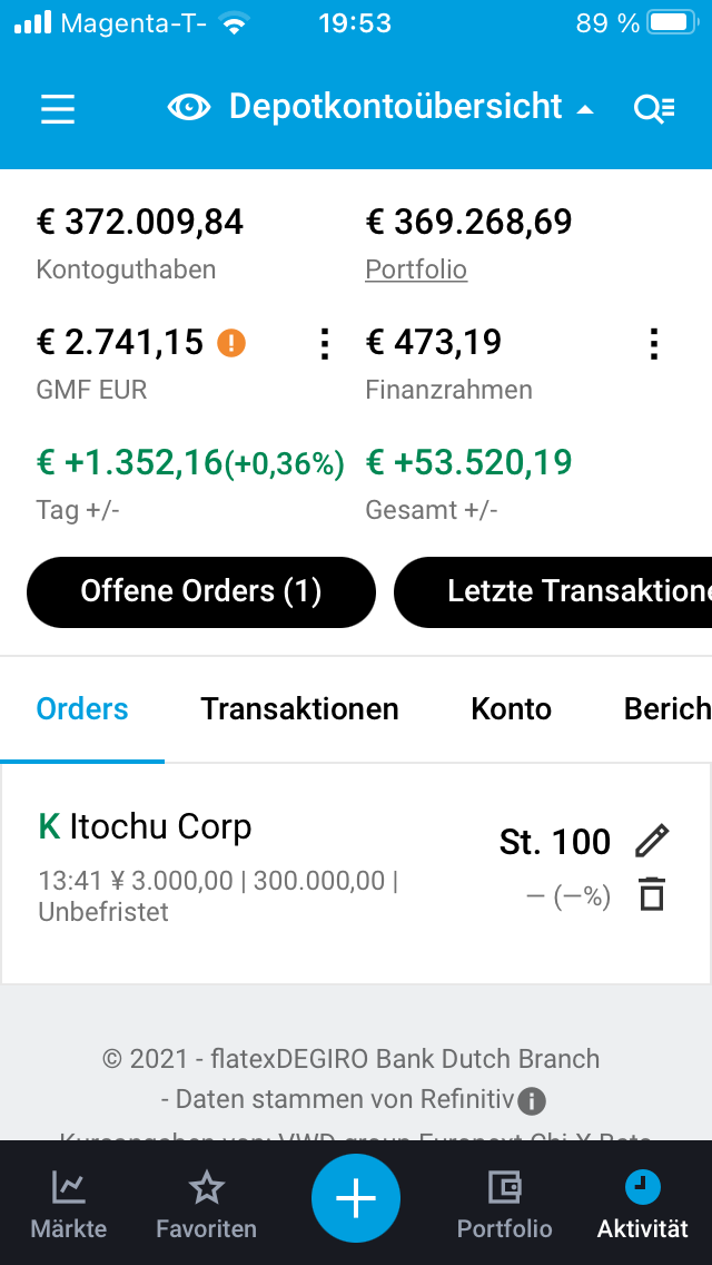 Mein geplanter Kauf für Itochu hat diese Woche nicht funktioniert – der Kurs schwankte so zwischen 3.200 bis 3.300 YEN. Den Limit-Kurs von 3.000 werde ich noch einige Zeit laufen lassen, entweder es kommt die Korrektur oder ich disponiere die rd. 2.000 EUR wieder in die Liquidität. Läuft also unverändert…