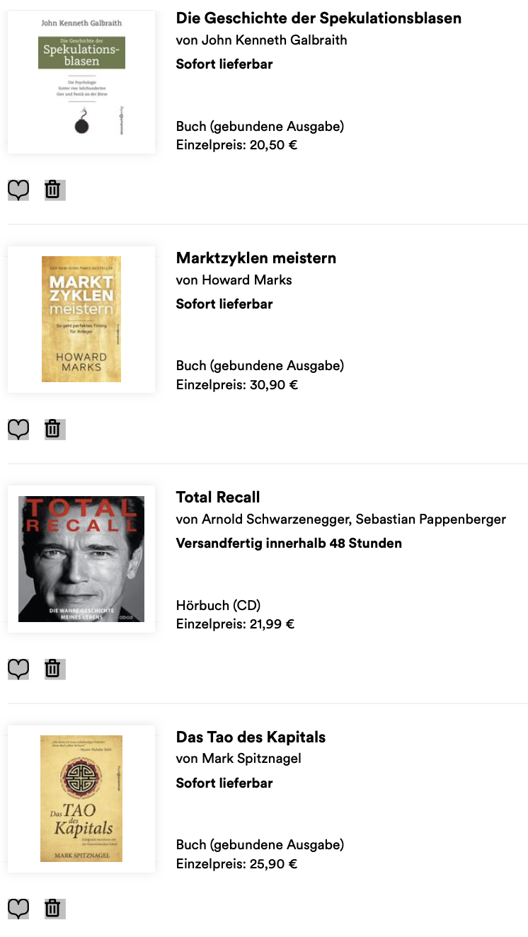 Zuletzt noch meine Wunsch- und Warenliste von Büchern die ich mir im nächsten Monat bestellen werde. Die Tipps für die Bücher kamen meistens aus Twitter. Das Hörbuch für Arnold Schwarzenegger als Begleitung beim joggen und drei gebundene Bücher zur finanziellen Weiterbildung 📚
