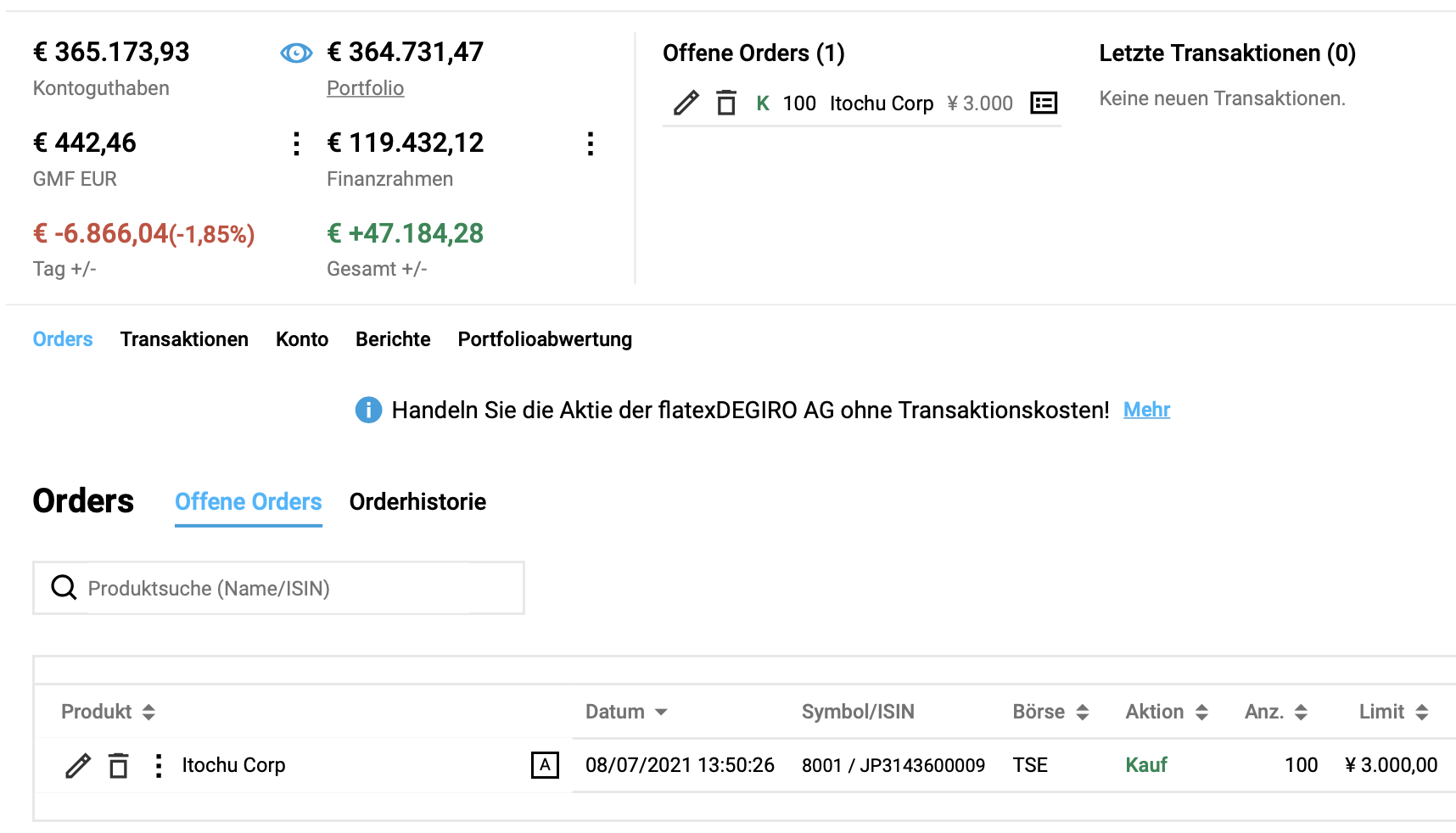 Aktuell korrigieren die Börsen etwas – daher habe ich eine bereits vor längerem geplanten Kauf von Itochu wieder aktiviert: