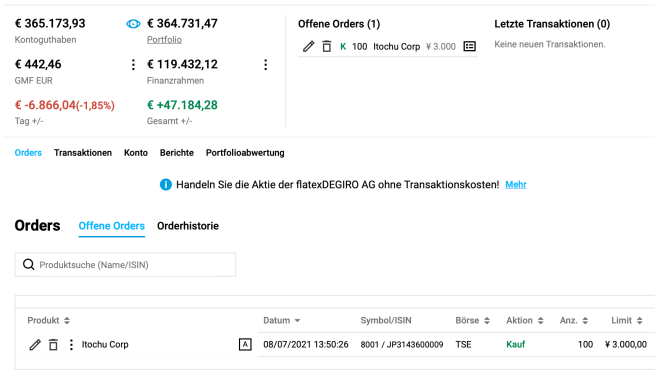 Dazu habe ich mein Depot bei DEGIRO von Basic auf Active umgestellt. Damit habe ich einen Finanzrahmen erhalten der mich etwas flexibler bei den Überweisungen macht. Die benötigten 2 TEUR sind aber von meiner Liquidität in der Überweisung unterwegs.