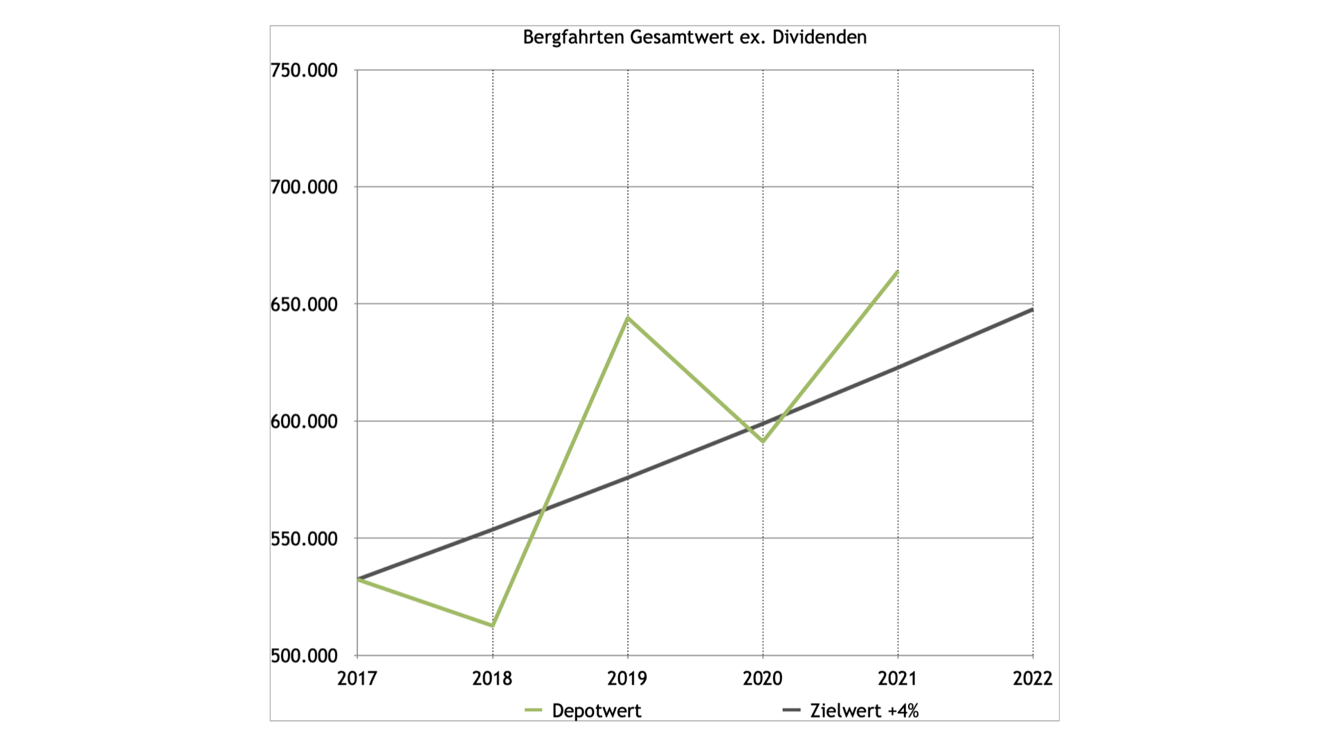 | Jahr | Ultimo | Depot | Änd. | Ziel +4% | Ziel EUR | Abw. |
