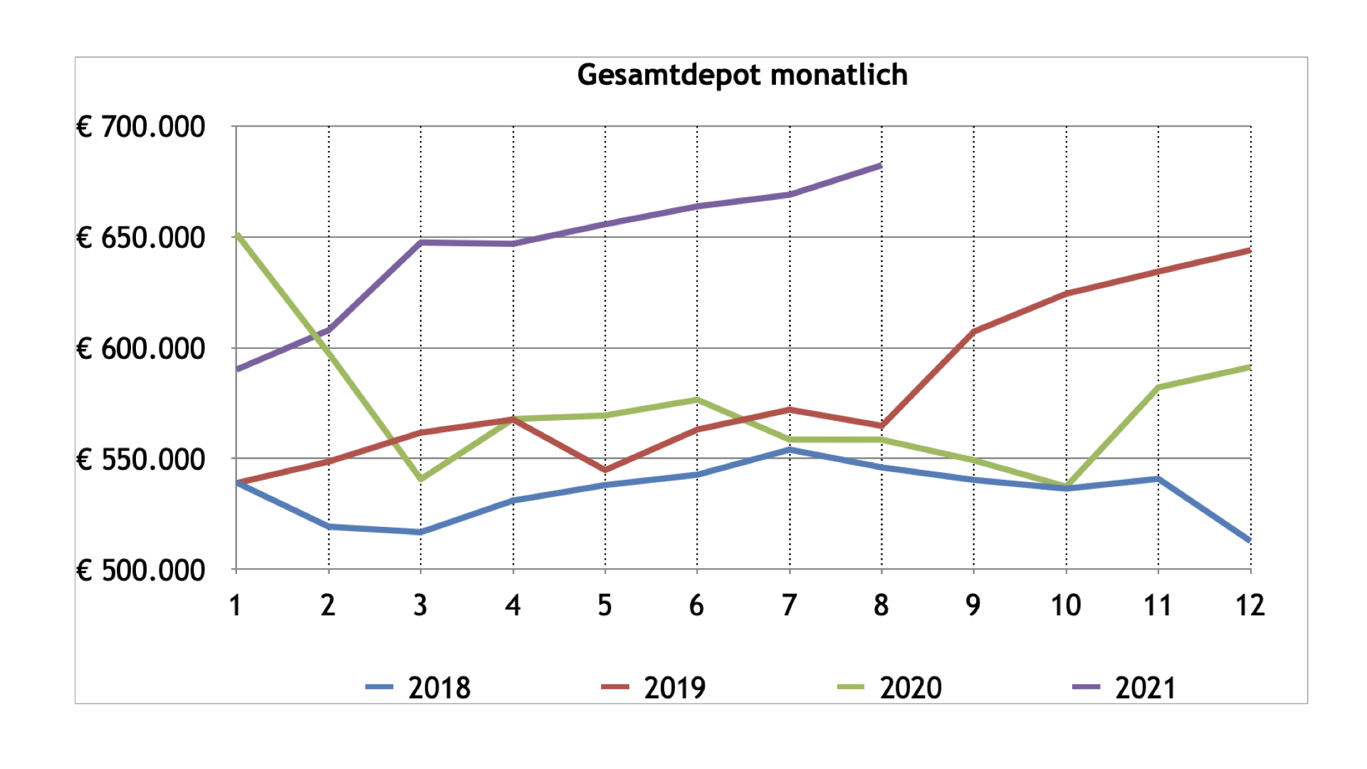 Also zuerst schaue ich auf die positiven Ergebnisse, etwas unerwartet war auch der August mit steigenden Börsenkursen und somit erfolgte ein weiteres All Time High mit 682.354,79 🙂
