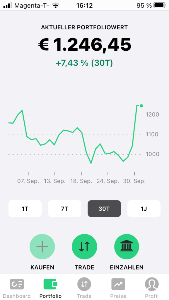 Und wenige Minuten nach meinem Sparplan für Bitcoin gab es mal wieder eine Kursschwankung – diesmal nach oben 😊