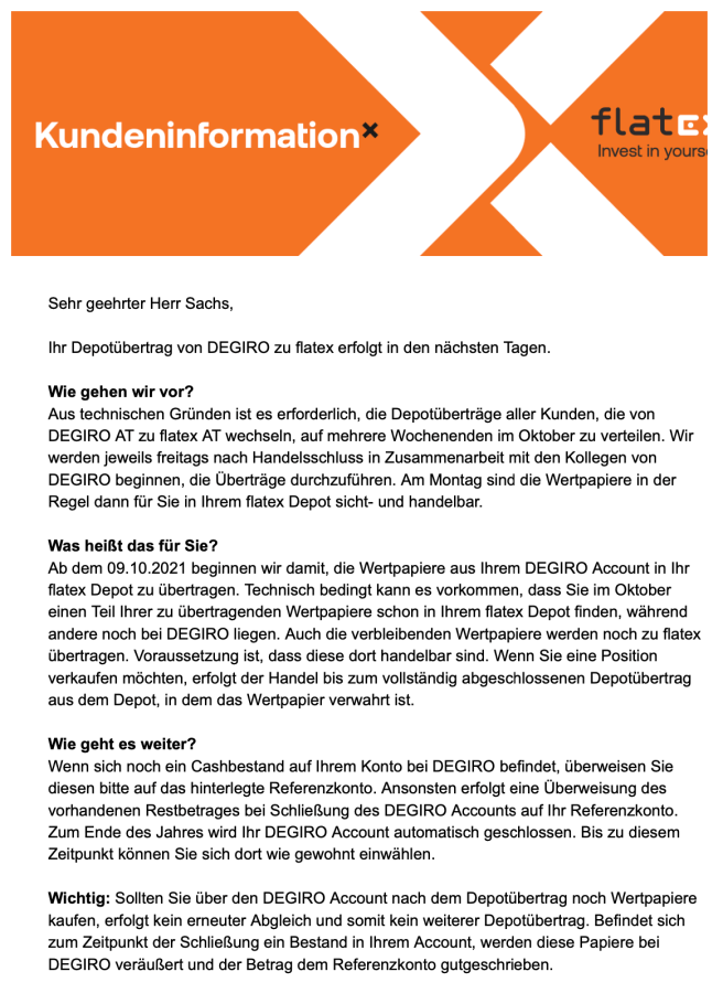 Flatex hat mich nun informiert, dass in diesem, und den folgenden Oktober-Wochenenden der Aktien-Übertrag von Degrio starten wird.