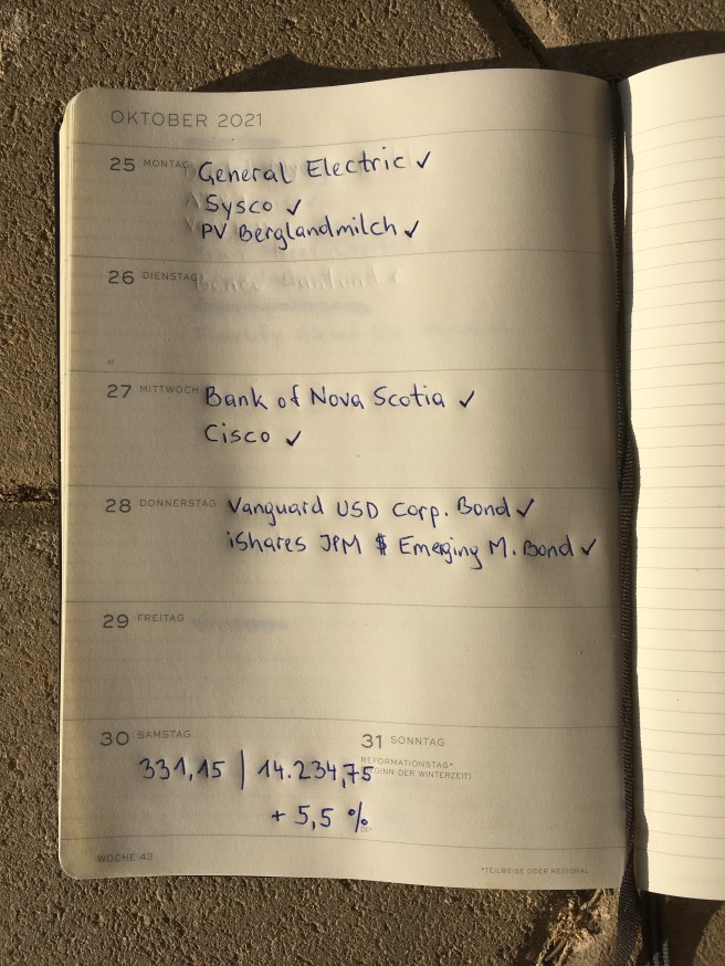 Also zuerst einmal die letzte Kalenderwoche 43, die letzte Abschlusswoche für Oktober 2021. Die Dividendeneinnahmen haben die Monatssumme auf knapp 1,6 TEUR gehoben 😊