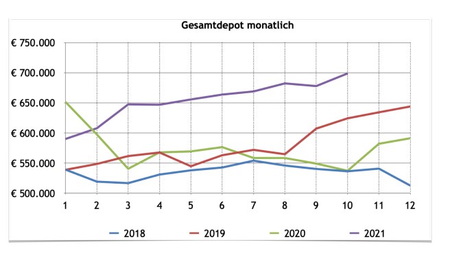 das Jahr läuft weiter besser als erwartet. Nach einer kleinen Korrektur im September wurde diese wieder aufgeholt und ein neues All Time High mit 698.891,65 erreicht.