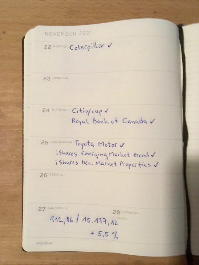 Nächste Woche endet der November und ich werde meinen Monatsbericht erstellen. Mit vielen Fixkosten und der noch fehlenden Ausschüttung des DWS Top Dividenden Fonds wird es knapp ob das 11. Monat knapp positiv oder negativ verlaufen wird.