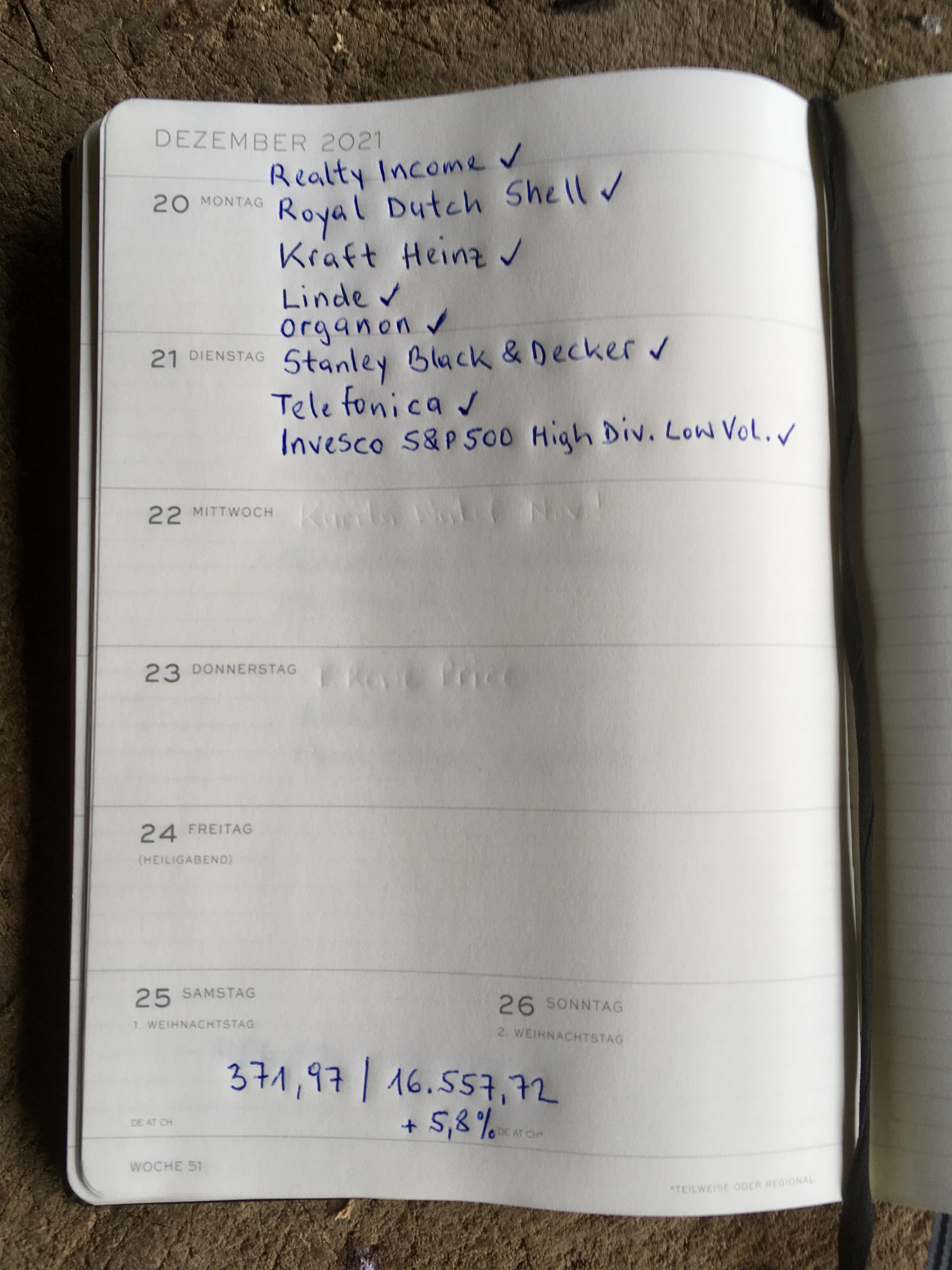 Wie in der Vergangenheit wird ein extra Wochenbericht entfallen bzw. in den Monatsbericht Dezember 2021 eingebaut. Der Jahresbericht 2021 und für meinen Schneeball wird dann Anfang Jänner erfolgen.