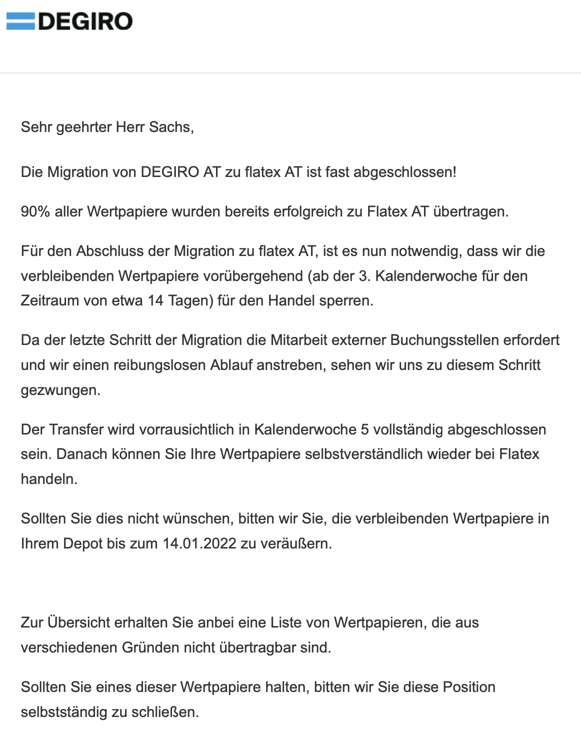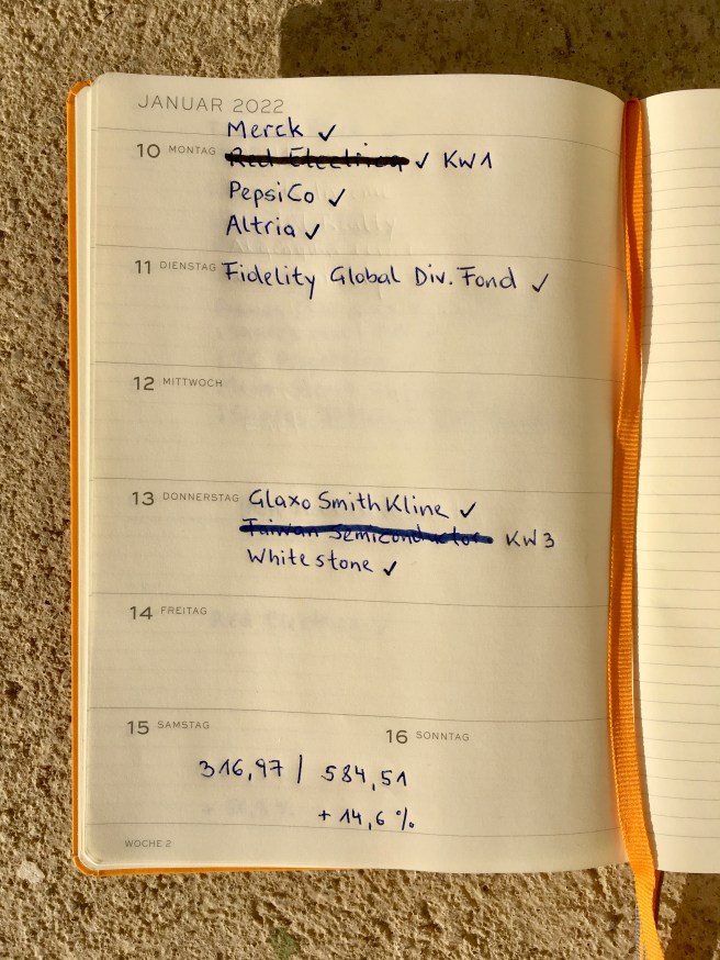 Zum Thema Depotübertrag kam diese Woche eine Information. Im Jänner 2022 sollen die verbliebenen Aktien – für mich sind 2 Positionen übrig – von Degiro zu Flatex übertragen werden. Es wäre angenehm dieses Thema seit Herbst 2021 abzuschließen…