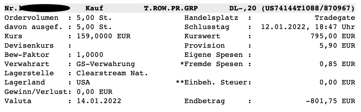 Zuerst ein paar Worte zum Nachkauf von T. Rowe Price Group Inc. ($TROW). Erst im Dezember hatte ich mir meine erste Position von 5 Stück ins Depot gelegt und freute mich über die erste Dividende, Ex-Tage war der 15.12., Zahltag der 30.12. und die Einbuchung bei Flatex Anfang Jänner 2022.