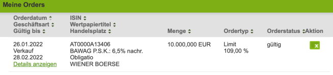 Diese Bawag PSK Anleihe mit 6,5% war bzw. ist ein tolles Investment mit monatlichen Auszahlungen. Leider hatte ich diese nicht sofort bei der Emission entdeckt und um 100% gekauft, sondern etwas später um 106% im Jahr 2014 an der Wiener Börse. Meine Entscheidung ist nun gefallen nicht bis zum Auslauf 2023 zu warten und 600 EUR Verlust + Spesen zu realisieren sondern jetzt noch mit einem kleinen Gewinn zu verkaufen. Damit wäre es für einen nachfolgenden Käufer noch finanziell interessant und daher setzte ich eine Verkaufsorder mit 109% Limit.