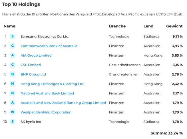 Meine Strategie war bisher Australien mit dem Vanguard ETF Asia Pacific ohne Japan abzubilden. Darin sind rd. 40% Australien veranlagt und weiters 10% auf Samsung. Hier die Top 10 Investments…