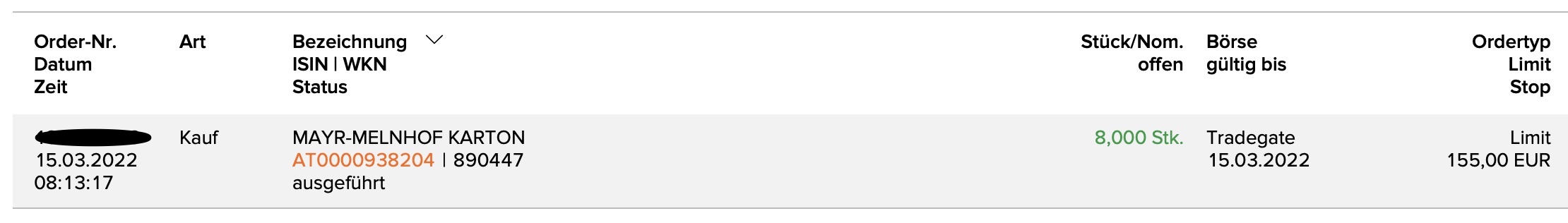 Im Depot hatte ich bisher 2 Stück Mayr-Melnhof als Watchlist. Der aktuelle Nachkauf von 8 Stück bringt mich in eine Startposition: