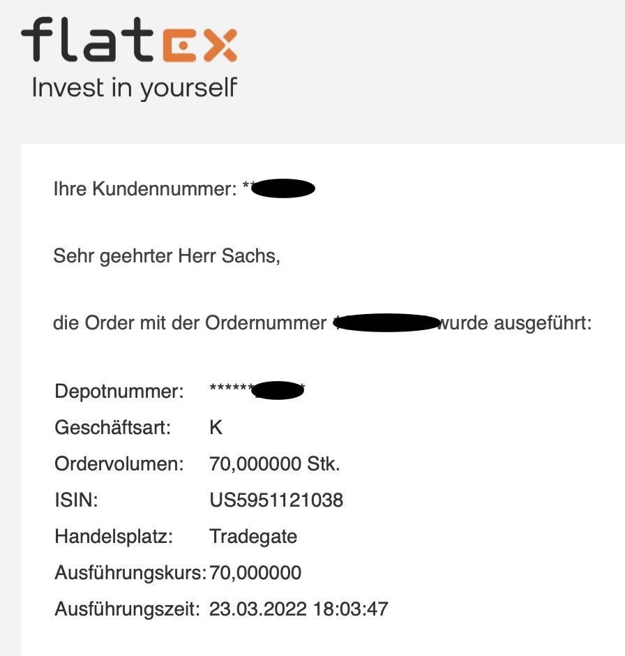 Mein Kauf von 70 Stück Micron Technology erfolgte gestern mit rd. 4,9 TEUR.
