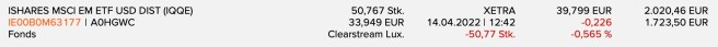 | 129 | IE00B0M63177 | 50,767 | iSHARES MSCI EM MARKETS | 2.011,38 | 0,28 % |