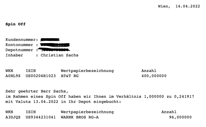 Kaum verkaufe ich ein paar Depotpositionen kommen fremdgesteuert wieder welche dazu. Der Spin Off von AT&T war lange angekündigt und der Zugang von Warner Bros. Discovery Inc. passt ganz gut in mein Portfolio. Bisher hatte ich keinen Titel aus der Unterhaltungsbranche obwohl ich Disney mal hatte und aktuell auf der Watchlist liegt.