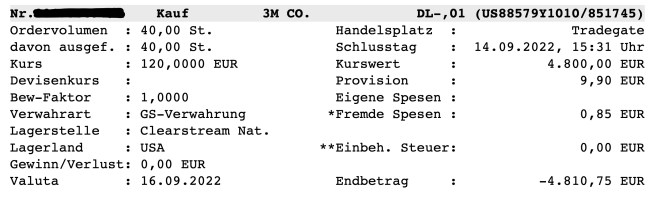 In meiner Liste der Nachkäufe stand 3M sehr weit oben. Neben der negativen Stimmung an den Börsen kommen dazu noch Prozesse (Ohrenstöpsel vom Militär) und schlechte Quartalszahlen. Somit wurde mein geplantes Ziel von von Kurs 120 EUR mit >4% Dividendenrendite erreicht und der Kauf durchgeführt.