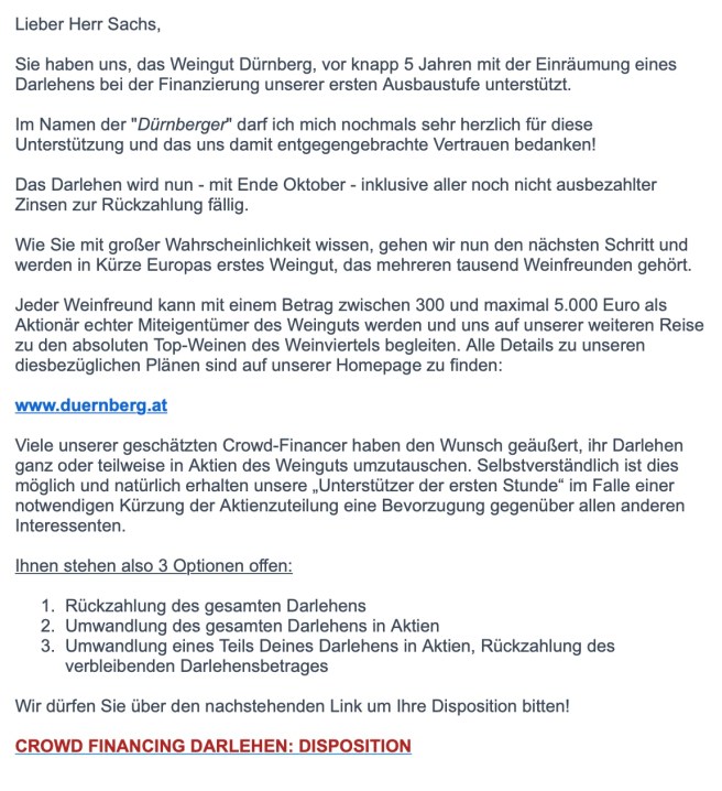 Seit ein paar Monaten war mir bekannt, dass das Weingut Dürnberg mit einer Kapitalerhöhung neue Aktien auflegen wird. Jene Investoren die im Jahr 2017 sich an einem Crowd Funding mittels Nachrangdarlehen beteiligt hatten wurden nun informiert ob Mann/Frau nun die Aktien zeichnen wollen oder das Darlehen zurück bezahlt werden möchten.