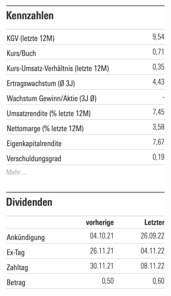 Ein Kurs/Buchwert-Verhältnis von kleiner 1 ist ein beliebter Indikator für Value Investments, weil der in der Bilanz ausgewiesene Wert des Unternehmens nicht im Marktpreis reflektiert wurde. Der Verschuldungsgrad von 0,19 finde ich finanziell auch gut und die Dividende wurde erhöht.