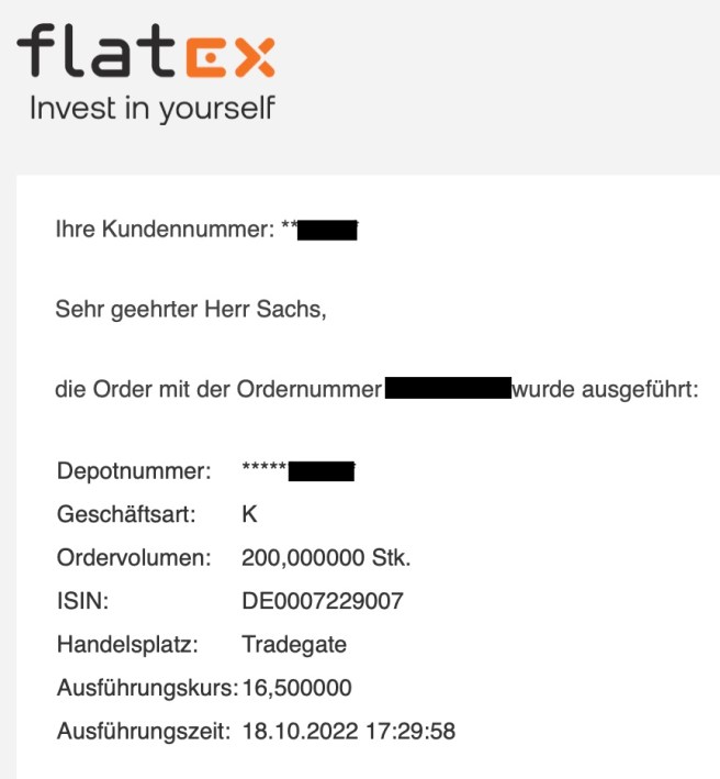 Somit liegen 300 Aktien in meinem Flatex Depot mit einem Netto-Investmentwert von 5 TEUR…
