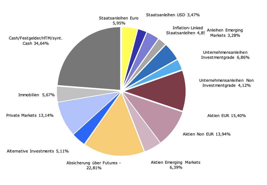 Meine private Vorsorge (Betriebsvermögen) liegt etwas einfacher mit 7 Anlageklassen. Meine persönliche Grafik schafft die aktuell „negative Liquidität“ nicht, daher nur dazu die Zahlen: