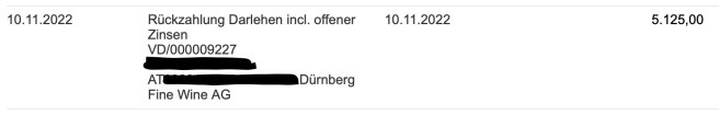 3. Das Nachrangdarlehen beim Weingut Dürnberg wurde zurückbezahlt und die jährlichen Zinsen überwiesen. Damit ist das Crowd Investment 2017-2022 abgeschlossen. Die 5 TEUR wandern zu 100% in den Margin Kredit bei Flatex und dieser wird bis spätestens Jahresende ausbezahlt sein. Die 125 EUR Zinsen bleiben für meine Ausgaben am Girokonto liegen ☺️
