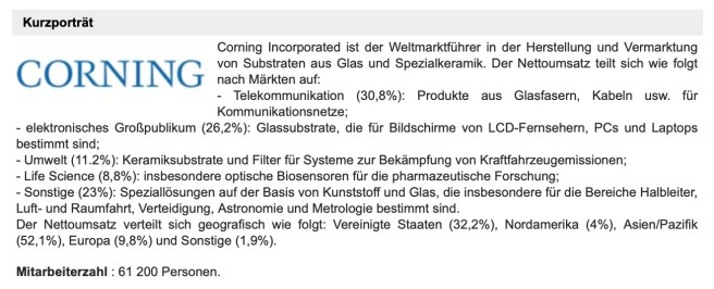 - Als Ersatz lag schon länger Corning Inc. in meiner Tech-Watch Liste wobei das auch zur Industrie Branche passen könnte. Morningstar hat das Unternehmen im Sektor Technologie und Branche Elektronische Bauelemente eingeordnet.
