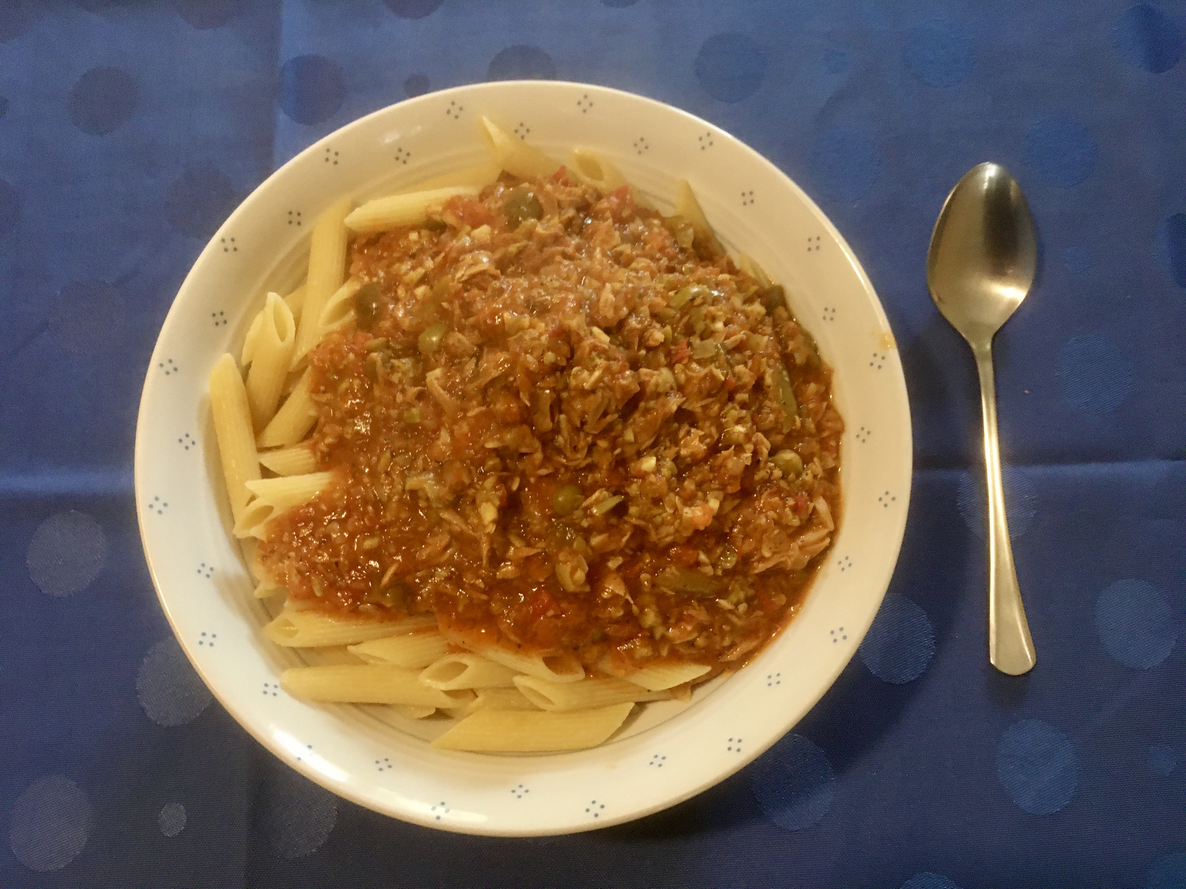 Das Ergebnis war der pannonische Standard – es gab eine würzige Tunfisch Paste mit der nicht mehr ganz frischen Gartenernte, Oliven und Penne für ein Mittagessen 👨🍳