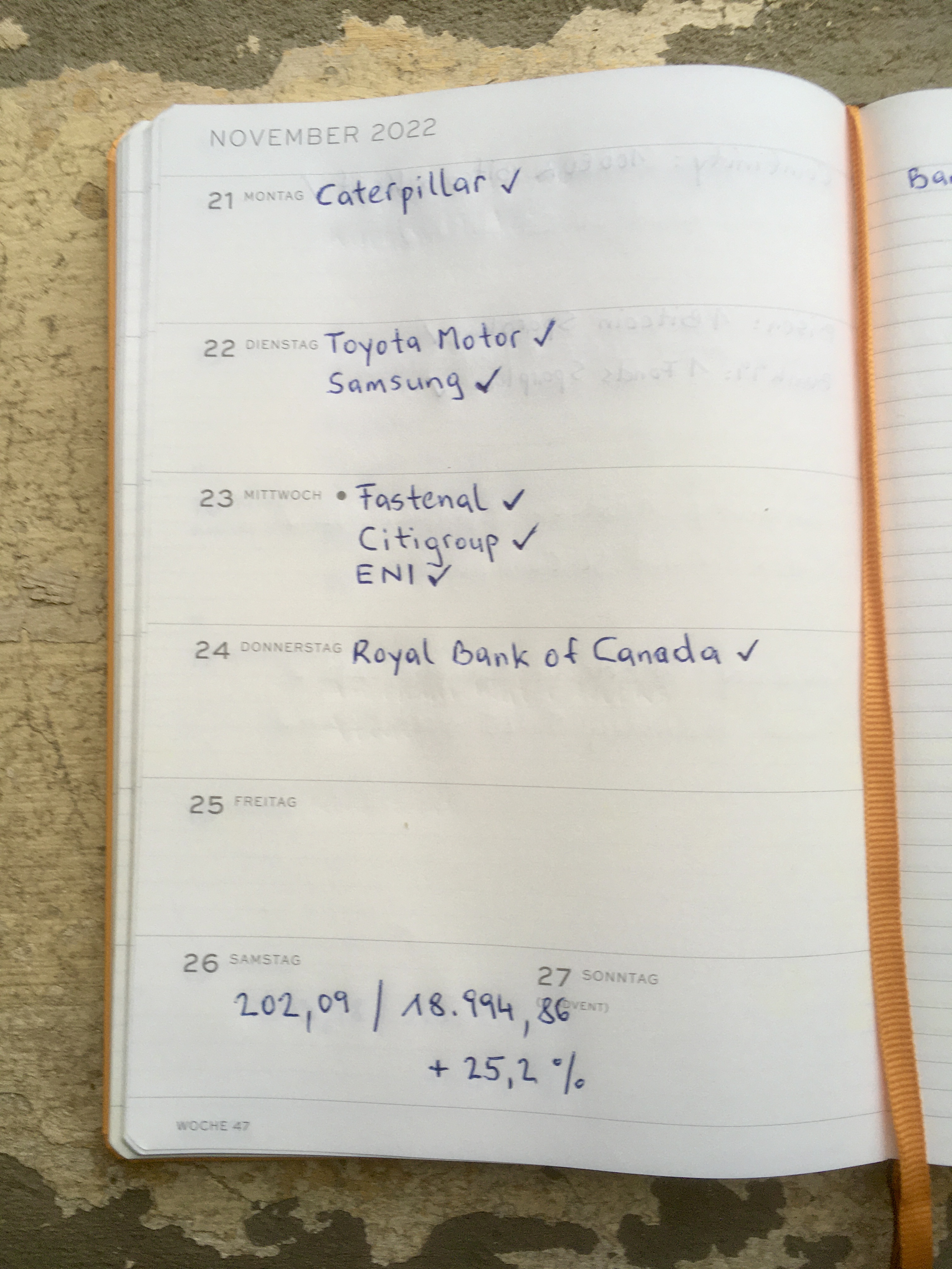 Der wöchentliche Blick in meinen Kalender zeigt dass nur mehr 5 Wochen bis zum Jahresende verbleiben und ich komme gleich zum Dividenden Einkommen in der Kalenderwoche 47 / 2022: