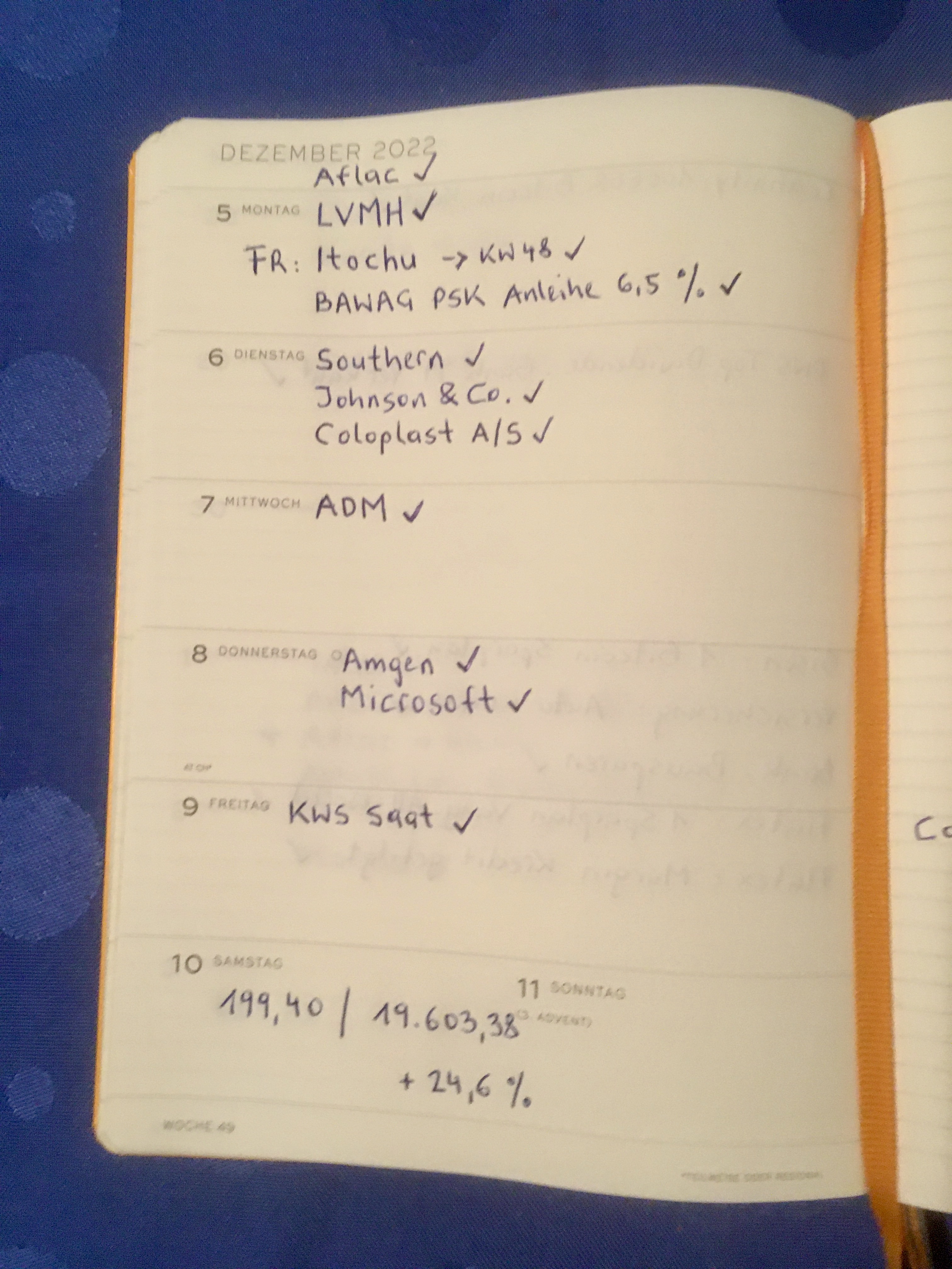 | DEZ | 48. INTEL, American Water Works, Itochu | 49. LVMH, Aflac Southern, J&J, Coloplast, ADM, Amgen, Microsoft, KWS Saat | 50. Unilever, Hawaiian Electric, Walgreen Boots, Target, Organon, 3M, Con Edison, Coca-Cola | 51. Linde, Organon, Corning, Waste Management, Telefonica, Stanley Black & Decker, | 52. Kraft Heinz, T.Rowe Price |
