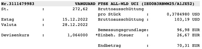 Heute wurde auch die Ausschüttung von Vanguard All-World überwiesen. Die Versteuerung von 27,5% ist ok und nun fehlt noch Kraft-Heinz und ein paar kleine Dividenden.