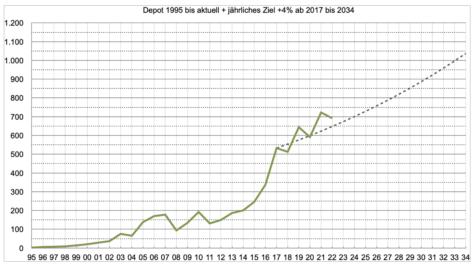 Aber ich denke langfristig, bei den Wertpapieren ab 1995. Somit einmal der Langfrist-Chart mit der Depotentwicklung:
