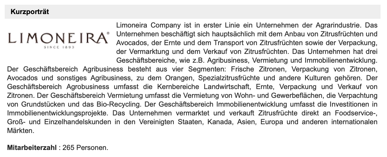 Diesmal ist mein Investment als Lebensmittelkonzern direkt an der Basis tätig. Das Unternehmen produziert, vermarktet und verkauft Zitronen, Avocados, Orangen, Pistazien und Kirschen.