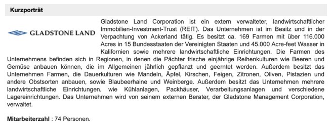 Ich hatte einmal ein Gladstone Unternehmen wegen der monatlichen Dividenden im Portfolio und es dann verkauft weil ich das Geschäftsmodell nicht verstanden habe. Das Thema Ackerland passt besser zu mir. Habe auch vor kurzem im Börsen-Kurier gelesen dass Bill & Melinda Gates u.a. mit ca. 100.000 Hektar die größten privaten Eigentümer von Farmland in der USA ist.