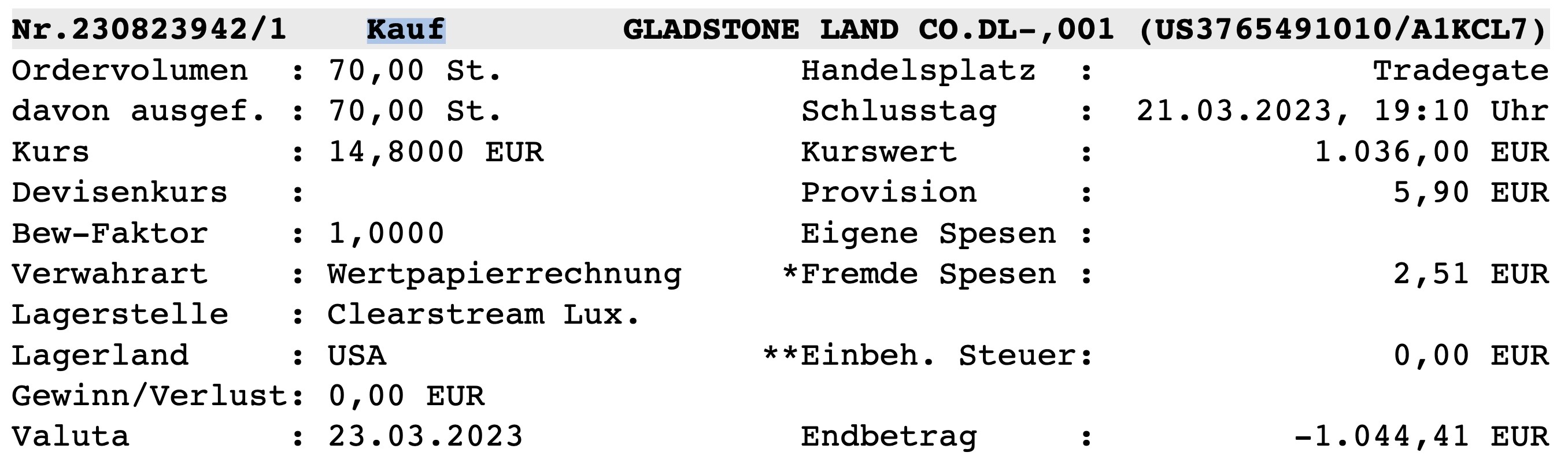 Wie es mit Gladstone Land Co. US3765491010 an der Börse weitergeht werde ich dann sehen. Ich habe mal einen Fuß auf dem Spielfeld 👟