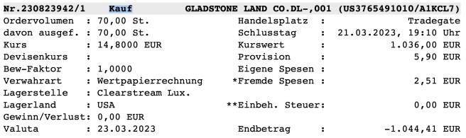 Ich habe die Gladstone Land auch seit längerem auf der Watchliste, nun ist sie entsprechend zurückgekommen. Bei der comdirect kann ich die allerdings nicht kaufen. Über welche Bank hast Du gekauft?