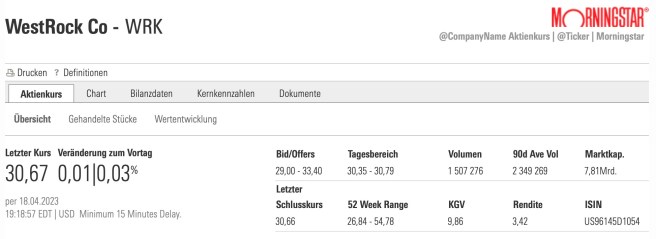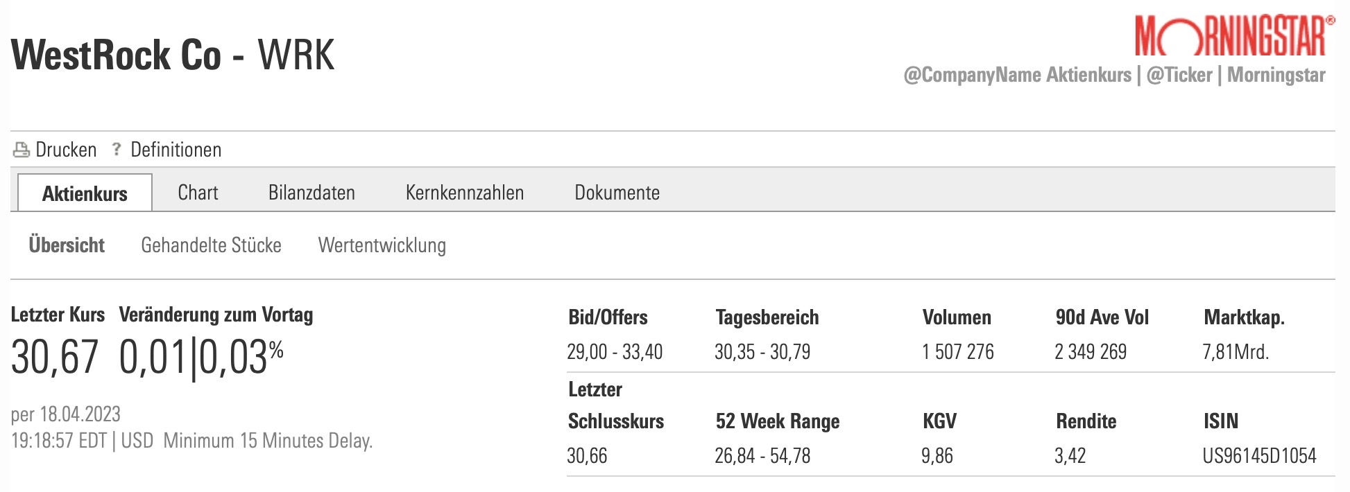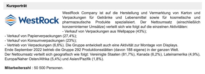 WestRock Company hat die Zentrale in Richmond, Virginia und ist ein Pappe- und Verpackungshersteller. Im Depot habe ich Mayr Melnhof aus Österreich die Mitbewerber sind.