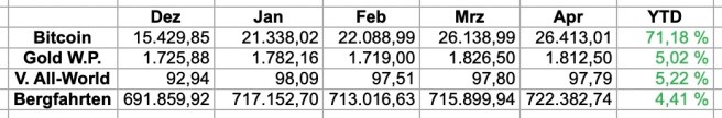 Der YTD Vergleich – Vanguard All-World ist unverändert zum Vormonat und bleibt mit 5,2% mit stärker technischer Gewichtung (ca. 20%). Das Betriebsvermögen stieg vom März mit +3,5% auf nun +4,4% mit Ende April…