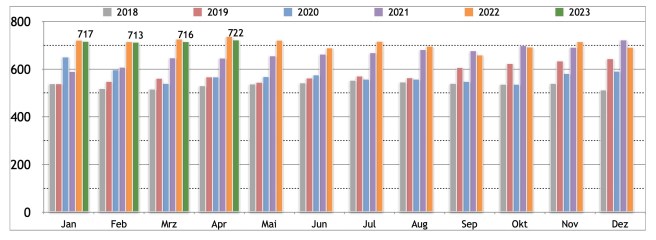 2023 bewegt sich seitwärts – aber jedes Monat ist deutlich über 700 TEUR und der April war das beste Ergebnis in diesem Kalenderjahr 😎
